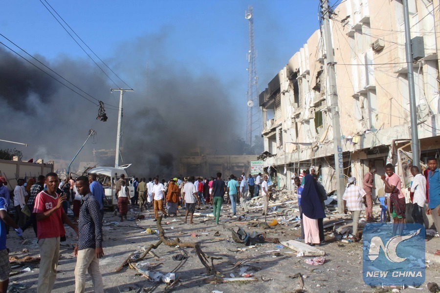 Photo taken on Oct. 14, 2017 shows the explosion site near Safari hotel in Mogadishu, capital of Somalia. At least 40 people were killed and several others injured in a deadly bomb explosion near a popular hotel in Somali capital of Mogadishu on Saturday, the police said. (Xinhua/Faisal Isse)