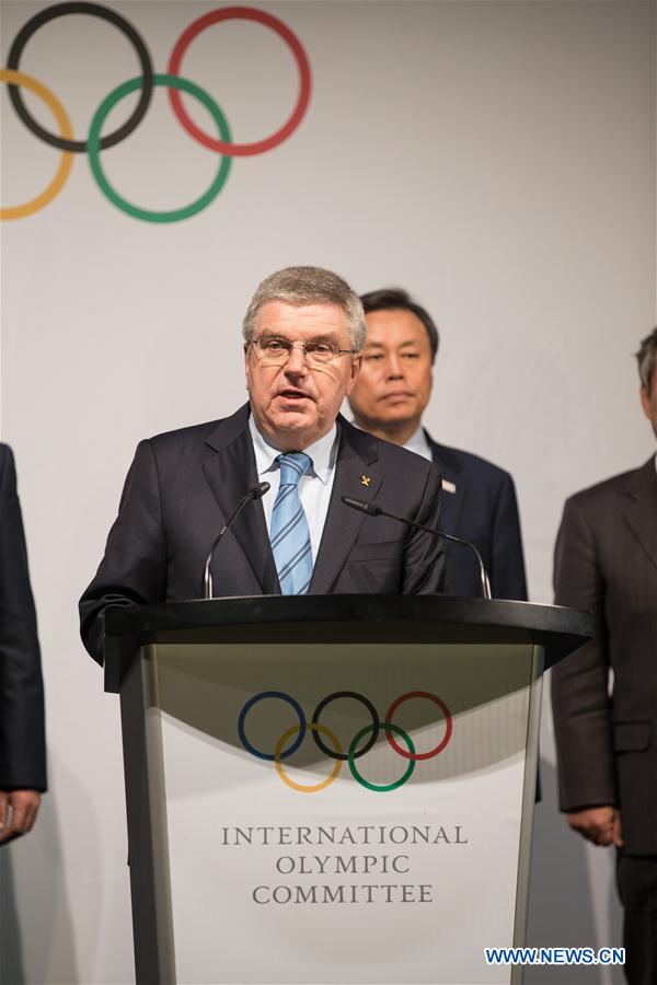 International Olympic Committee (IOC) President Thomas Bach (Front) speaks during a ceremony after a four-party meeting at the IOC headquarters in Lausanne, Switzerland, Jan. 20, 2018. (Xinhua/Xu Jinquan)