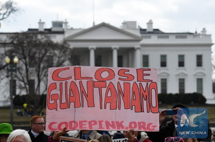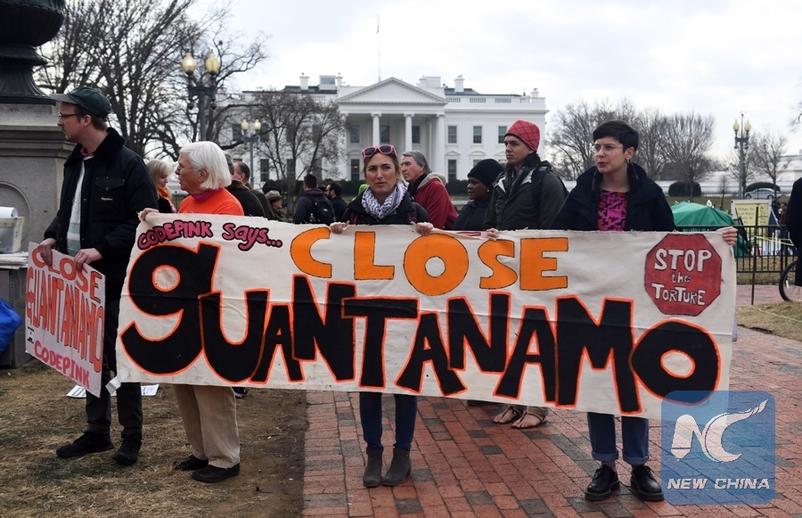Protesters rally to demand the closing of the Guantanamo Bay detention camp outside the White House in Washington D.C., the United States, on Jan. 11, 2018. (Xinhua/Yin Bogu)