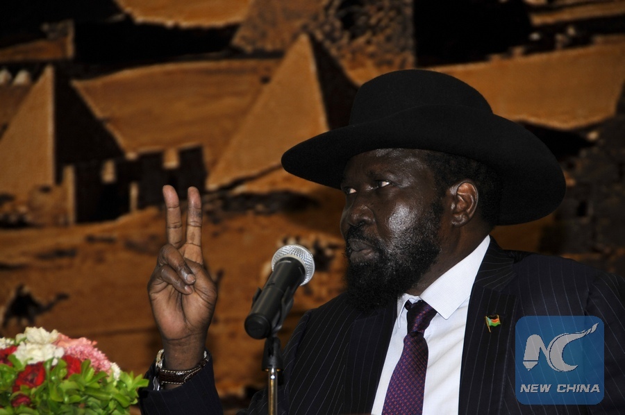 South Sudanese President Salva Kiir Mayardit addresses a press conference in Khartoum, capital of Sudan, on Nov. 2, 2017. South Sudanese President Salva Kiir Mayardit on Thursday denied accusation against his country of supporting armed groups in Sudan. (Xinhua/Mohamed Khidir)