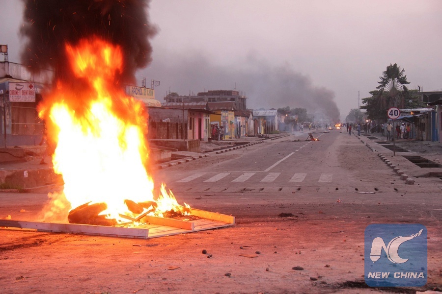 File photo shows protestors set fire on tires on a street in Kinshasa, capital of the Democratic Republic of Congo (DRC), Dec. 9, 2011. (Xinhua/Han Bing)