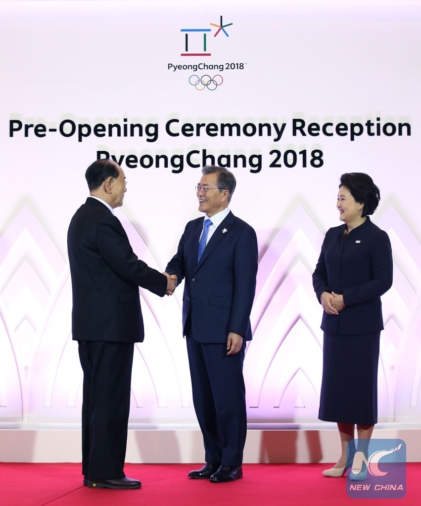 Kim Yong Nam(L), the president of the Presidium of the Supreme People's Assembly of the Democratic People's Republic of Korea (DPRK), is welcomed by South Korean President Moon Jae-in and his wife before a pre-opening ceremony reception of the PyeongChang Winter Olympics in PyeongChang, South Korea, Feb. 9, 2018. (Xinhua/Yao Dawei)