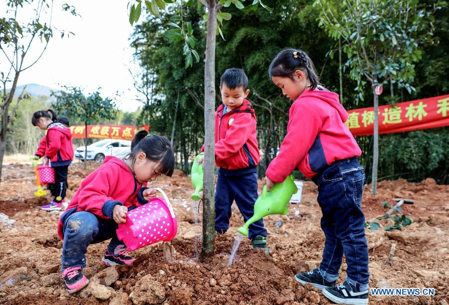 Children water a tree during a tree planting activity at Lijiaxiang Township of Changxing County, east China's Zhejiang Province, March 12, 2018. A tree planting activity aimed at fostering children's awareness about environmental protection was held here. (Xinhua/Xu Xu)
