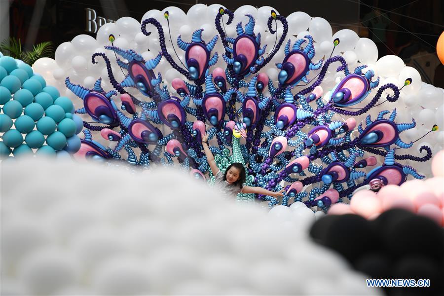 A little girl poses with a balloon animal at the "Fantasy Zoo Balloon Fair" held at Singapore's Marina Square on March 15, 2018. The "Fantasy Zoo Balloon Fair" is held from March 9 to 18 at the Marina Square. (Xinhua/Then Chih Wey)