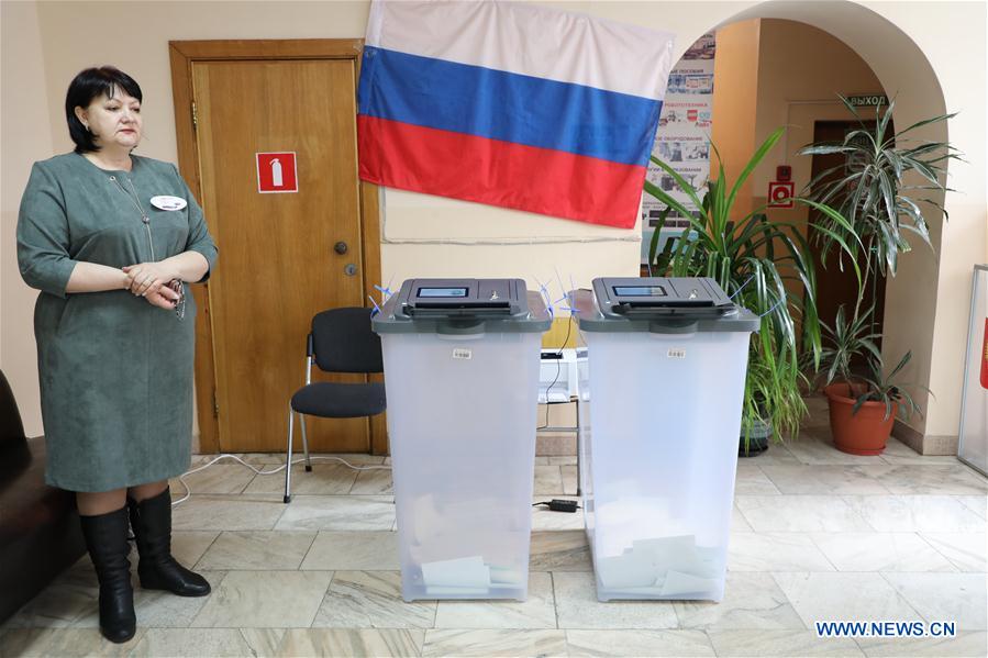 An election worker stands next to a ballot box at a polling station in Vladivostok, eastRussia, March 18, 2018. Russia held presidential election on Sunday. (Xinhua/Denis)