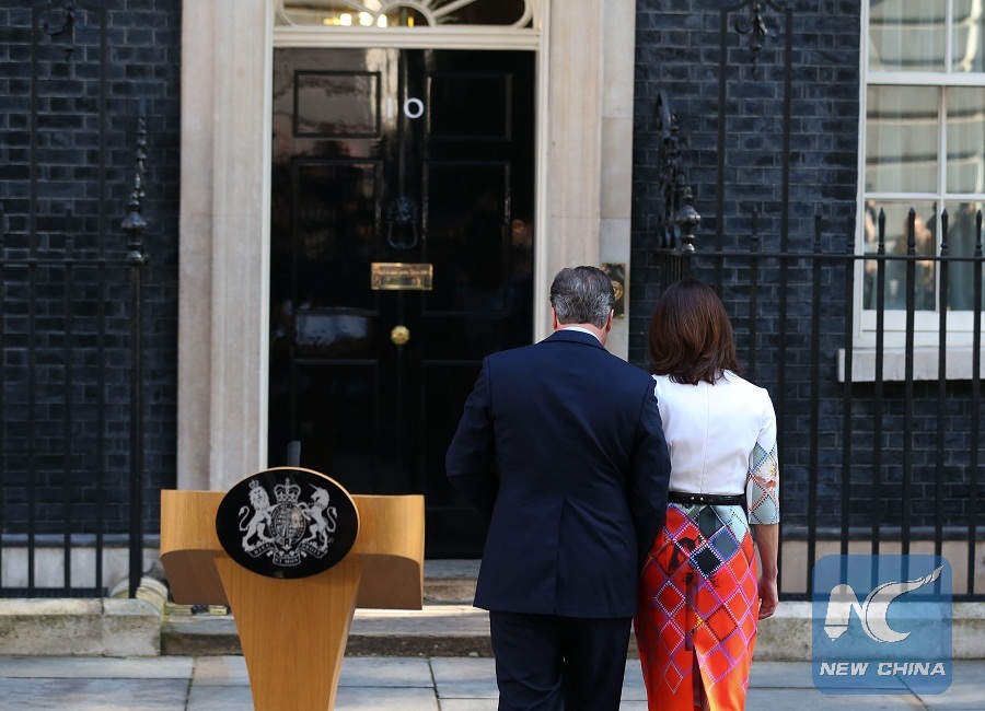 Photo taken on June 24, 2016 shows then British Prime Minister David Cameron (L) leaving with his wife Samantha after his speech at 10 Downing Street in London, Britain. Cameron announced his intention to step down after his country has voted to leave the European Union (EU). (Xinhua/Han Yan)