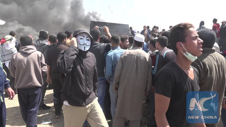 GAZA, April 6 (Xinhua) -- Amid the heavy black smokes of burnt car tires and the buzzing sounds of of bullets, Bashar al-Daya, a Palestinian young man, was busy painting a map of Palestine during an anti-Israeli protest along the Gaza-Israel border.