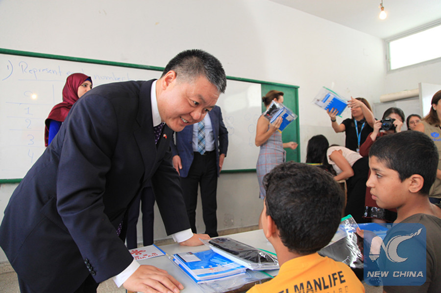 In this file photo, Chinese Ambassador to Lebanon Wang Kejian delivered school supplies to Syrian refugee students in a school in Beirut, Lebanon on Oct. 23, 2017. China donated 1 million U.S. dollars to the UNICEF for providing school aid to Syrian refugee students in Lebanon. (Xinhua/Li Liangyong)