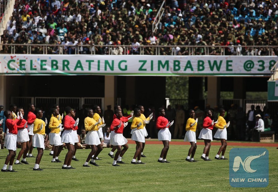 Zimbaweans dance during a celebration marking the nation's 38th independence anniversary at the National Sports Stadium in Harare, Zimbabwe, April 18, 2018. (Xinhua/Shaun Jusa)