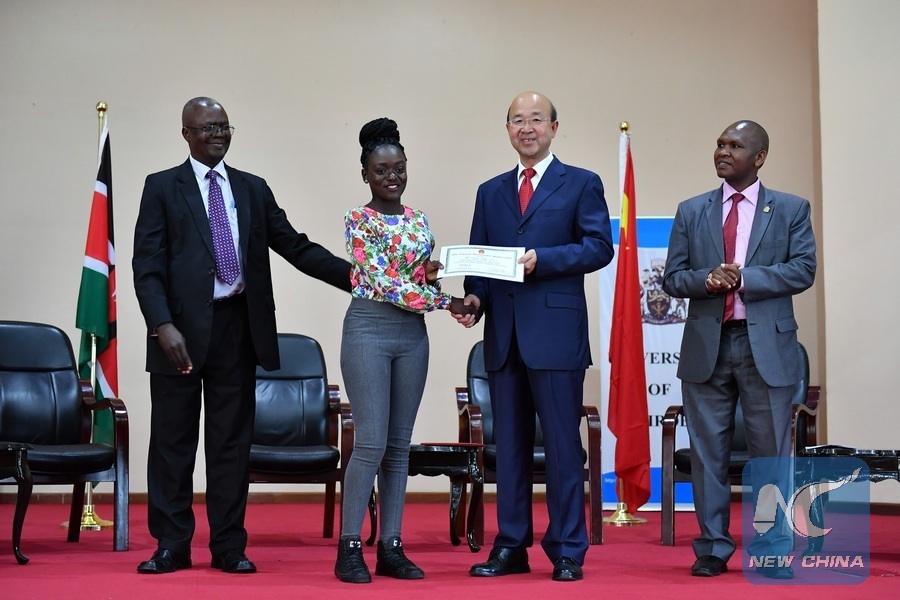 Chinese Ambassador to Kenya Liu Xianfa (2nd R) presents certificate of scholarship to a student of the Nairobi University in Nairobi, Kenya, Nov. 14, 2016. The Chinese Embassy in Kenya on Monday provided 20 scholarships worth 20,000 U.S. dollars for needy university students to enable them to pursue a range of humanities and science courses. (Xinhua/Sun Ruibo)