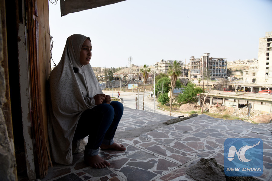 Aleppo, Syria, May 7 (Xinhua) -- Amina's only dream is to be able to read and write in a safe house, as her worst nightmare is falling off her half destroyed balcony, which she referred to as the "home of destruction" in Syria's Aleppo city.