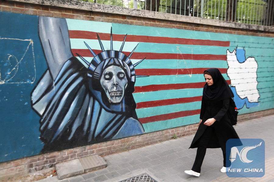 An Iranian woman walks past a mural on the wall of the former U.S. embassy in the Iranian capital Tehran on May 8, 2018. (AFP photo)
