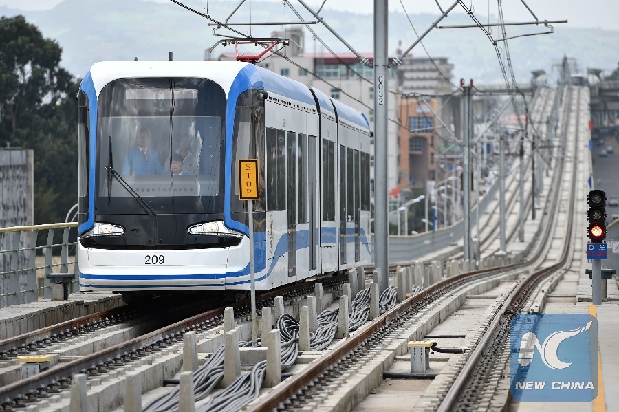 Photo taken on Sept. 20, 2015 shows a train operating on the light rail in Addis Ababa, Ethiopia. (Xinhua/Sun Ruibo)