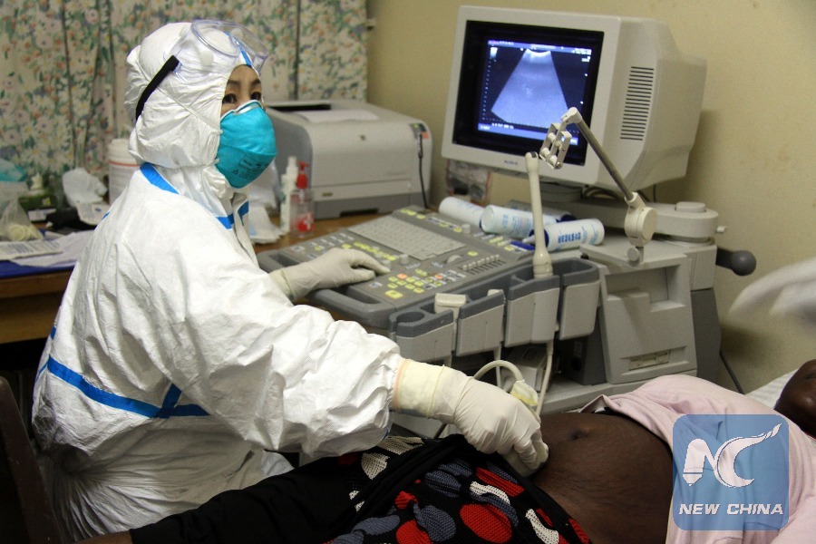 A member of Chinese Medical Team to Liberia examines a local patient in Monrovia, Liberia, Oct. 23, 2014. (Xinhua)