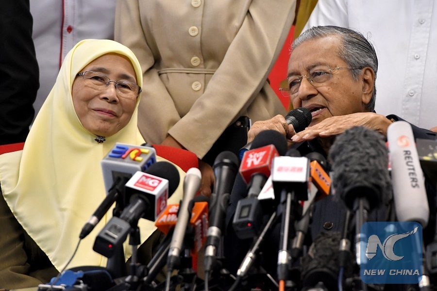 Malaysian Prime Minister Mahathir Mohamad (R) attends a press conference in Petaling Jaya, Selangor, Malaysia, May 17, 2018. (Xinhua/Chong Voon Chung)
