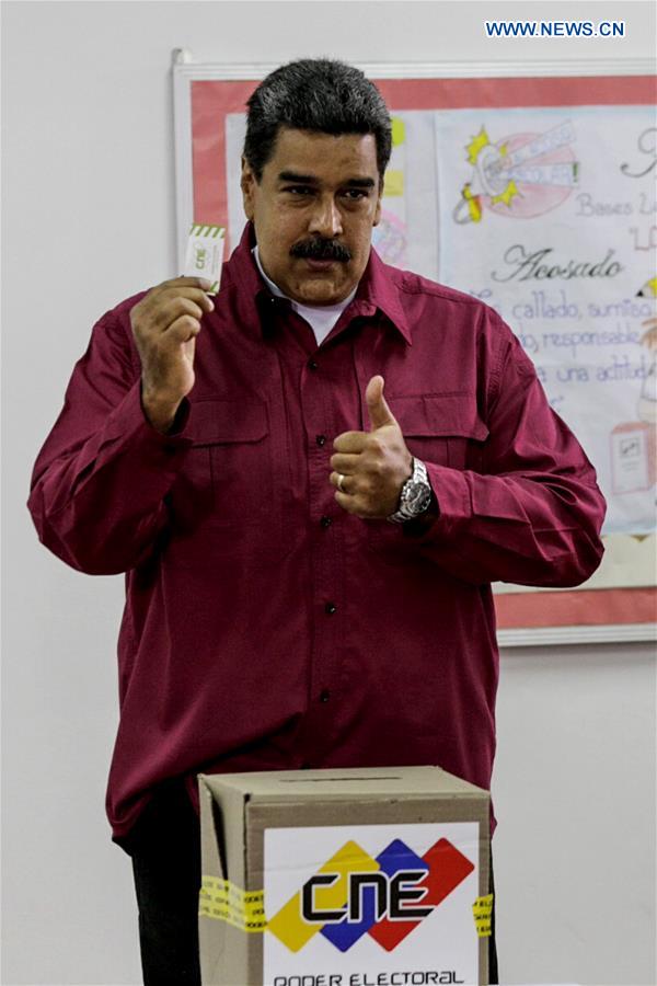 Venezuelan President Nicolas Maduro casts vote during the presidential election in Caracas May 20, 2018. Nicolas Maduro was reelected for a second six-year term in the presidential election on Sunday, according to the National Electoral Council. (Xinhua/Boris Vergara)