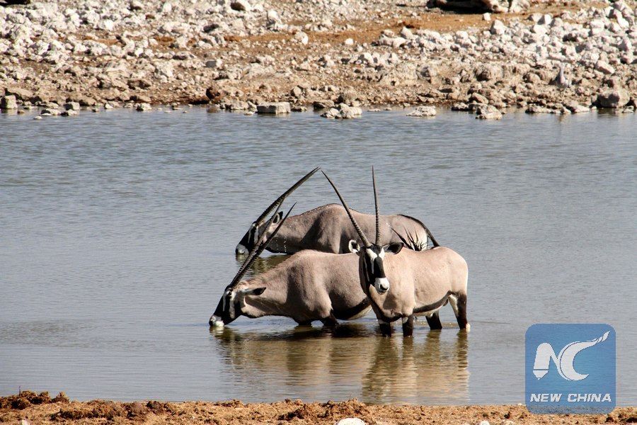 Oryx are seen at a water point in the Etosha National Park, northwestern Namibia, July 30, 2016. (Xinhua/Wu Changwei)