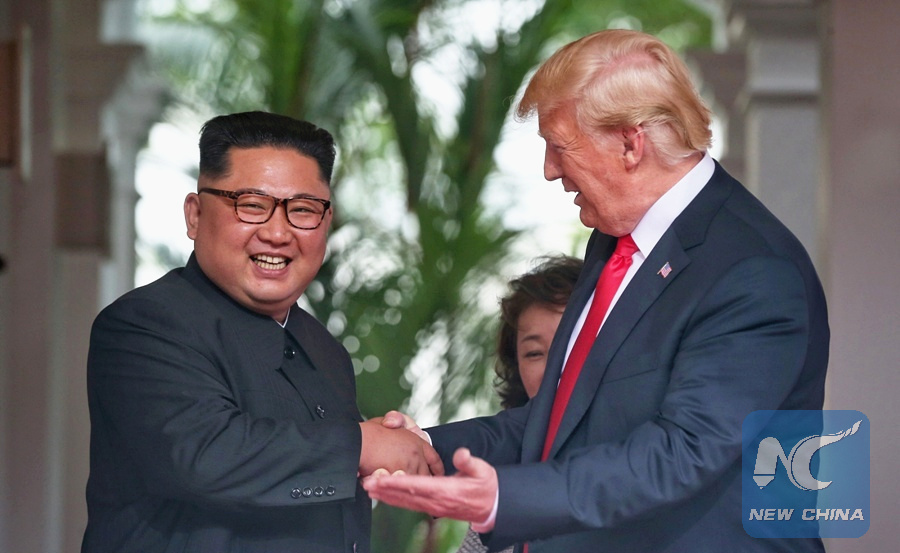 Top leader of the Democratic People's Republic of Korea (DPRK) Kim Jong Un (L) meets with U.S. President Donald Trump in Singapore, on June 12, 2018. (Xinhua/The Straits Times)