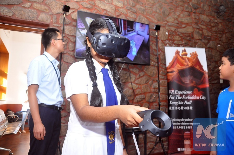 Local student experiences virtual reality (VR) equipment during the "Silk Road Memory - NICE Choice Exhibition of Chinese Creative Cultural Products" exhibition in Colombo, Sri Lanka, June 12, 2018. (Xinhua/Ajith Perera)
