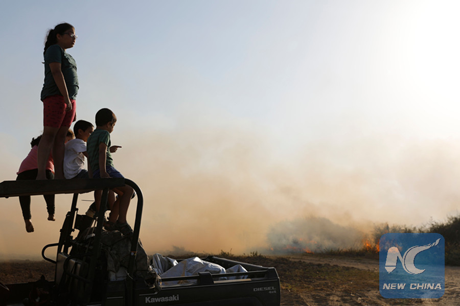 Israeli children look at fire after a kite was reportedly sent by Palestinian protesters from across the border to burn fields in Kibbutz Beeri near the border with the Gaza Strip on June 5, 2018. (AFP photo)