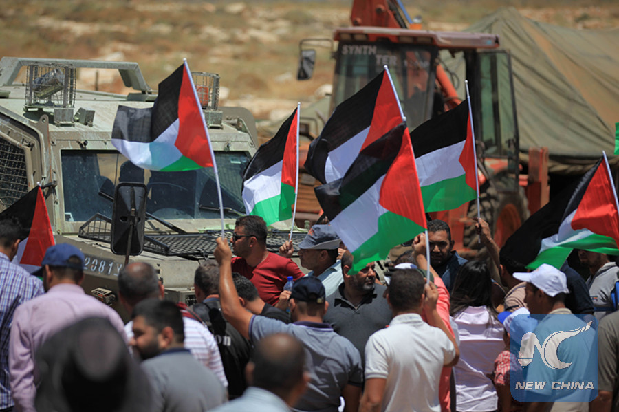 Palestinians hold national flags in front of Israeli soldiers as they take part in a protest against a new Jewish settlement outpost near the West Bank City of Hebron, on June 26, 2018. (Xinhua)