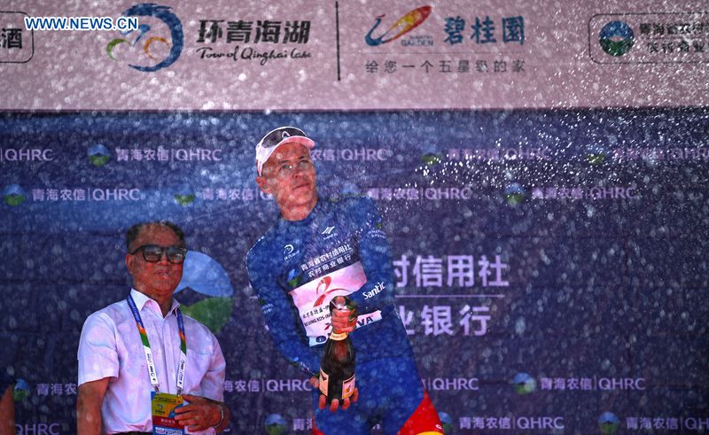 Ilya Davidenok from Chinese Beijing XDS - Innova Cycling Team(XDS) celebrates with the blue jersey for best Asian cyclist, at the award ceremony of the fourth stage of the Tour of Qinghai Lake in northwest China's Qinghai Province, on July 25, 2018. (Xinhuanet Photo by Yang Shoude)