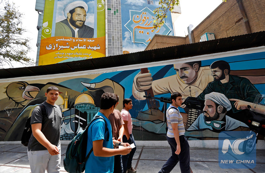 Pedestrians walk past a graffiti mural, depicting scenes of fighters with the Kaaba from the Haram al-Sharif mosque in Mecca and the Dome of the Rock in Jerusalem, painted along Palestine Square in the Iranian capital Tehran on July 24, 2018. (AFP photo)