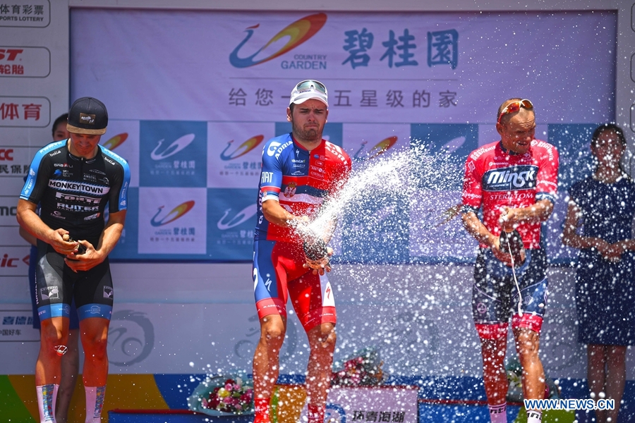 Winners celebrate at the award ceremony of tenth stage of the Tour of Qinghai Lake in northwest China's Gansu Province, on August 1, 2018. (Xinhuanet Photo by Yang Shoude)