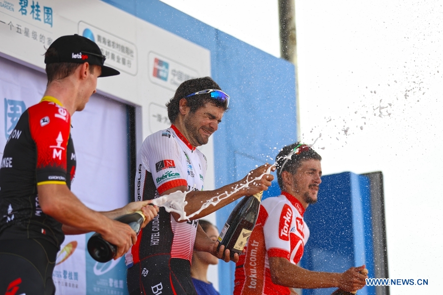 Winners celebrate at the award ceremony of the twelfth stage of the Tour of Qinghai Lake in Yinchuan, northwest China's Ningxia Hui Autonomous Region, on August 3, 2018. (Xinhuanet Photo by Jia Haiyuan)
