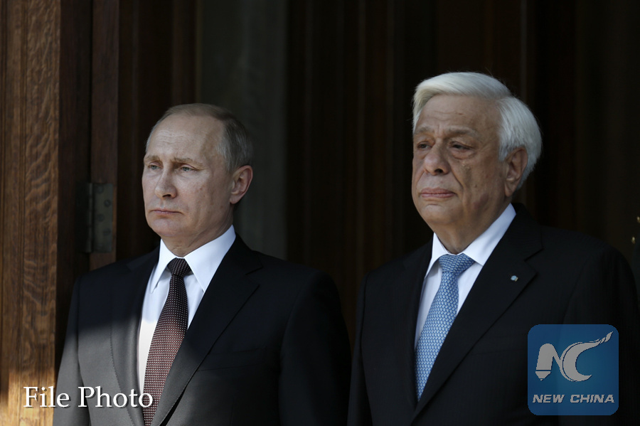 Greek President Prokopis Pavlopoulos(R) welcomes visiting Russian President Vladimir Putin at the Presidential Palace in Athens, Greece, May 27, 2016. (Xinhua/Alkis Konstantinidis/pool)