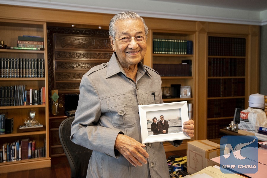 Malaysian Prime Minister Mahathir Mohamad demonstrates a picture showing his visit to China in the 1980s during an interview with Xinhua in Putrajaya, Malaysia, on Aug. 16, 2018. (Xinhua/Chong Voon Chung)