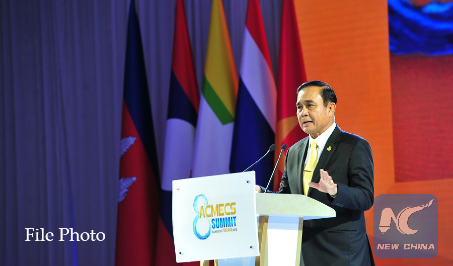 Thai Prime Minister Prayut Chan-o-cha delivers a speech at a press conference during the 8th Ayeyawady-Chao Phraya-Mekong Economic Cooperation Strategy (ACMECS) Summit in Bangkok, Thailand, June 16, 2018. (Xinhua/Rachen Sageamsak)