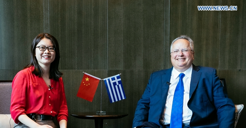 Greek Foreign Minister Nikos Kotzias (R) receives an exclusive interview with Xinhuanet in Beijing, Aug. 27, 2018. (Xinhuanet/Guo Xiaotian)