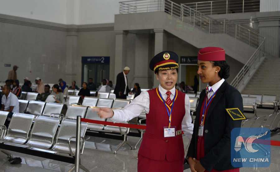 Lebu Railway Station attendants are seen at the station in Addis Ababa, capital of Ethiopia, March 25, 2018. The Chinese-built 756-km electrified rail project connects landlocked Ethiopia to Djibouti. (Xinhua/Wang Shoubao)