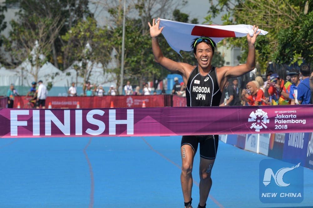 Hosoda Yuichi of Japan mixed relay team celebrates after finishing the mixed relay Triathlon at the 18th Asian Games in Palembang, Indonesia, Sept. 2, 2018. Japan mixed relay triathlon team won the gold medal.(Xinhua/Veri Sanovri)