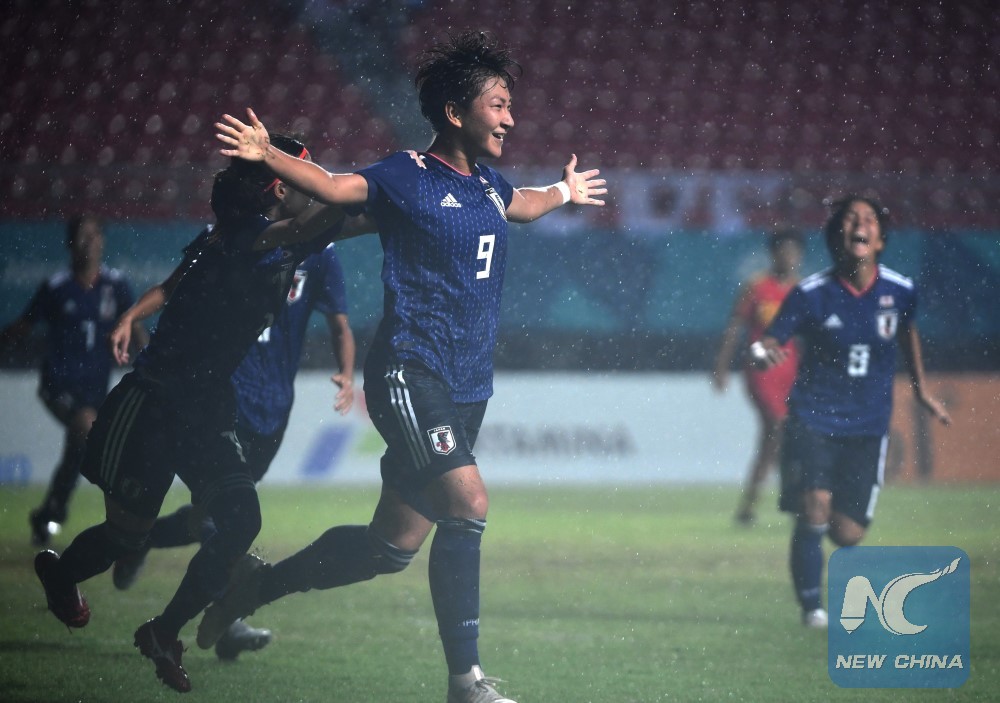 Sugasawa Yuika (C) of Japan celebrates after scoring during the women's football final match between China and Japan at the 18th Asian Games in Palembang, Indonesia, Aug. 31, 2018. (Xinhua/Wang Shen)