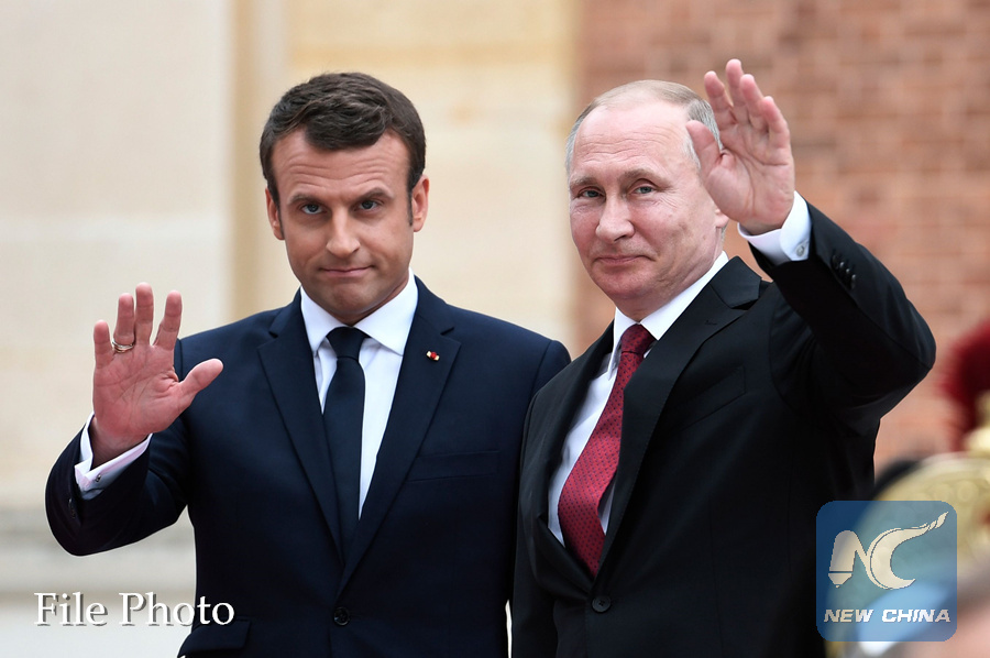 In this file photo taken on May 29, 2017 Russian President Vladimir Putin (R) and French President Emmanuel Macron wave upon their arrival at the Versailles Palace, near Paris, ahead of their meeting. (AFP PHOTO)