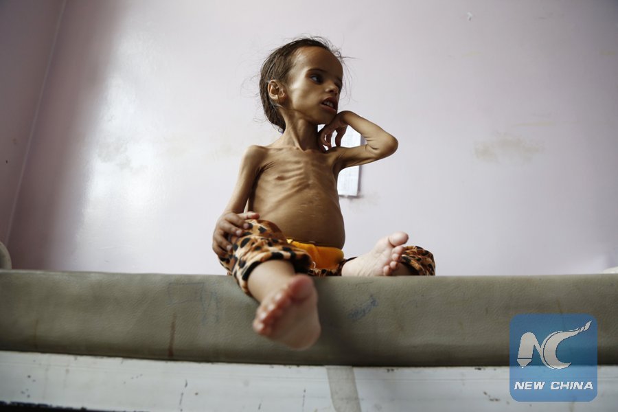 A malnourished 4-year girl sits on a bed as she waits to be weighed while she receives treatment at a malnutrition department in a hospital in Sanaa, Yemen, on Sept. 2, 2018. Millions of people in the war-torn Yemen are unable to secure one meal a day. (Xinhua/Mohammed Mohammed)