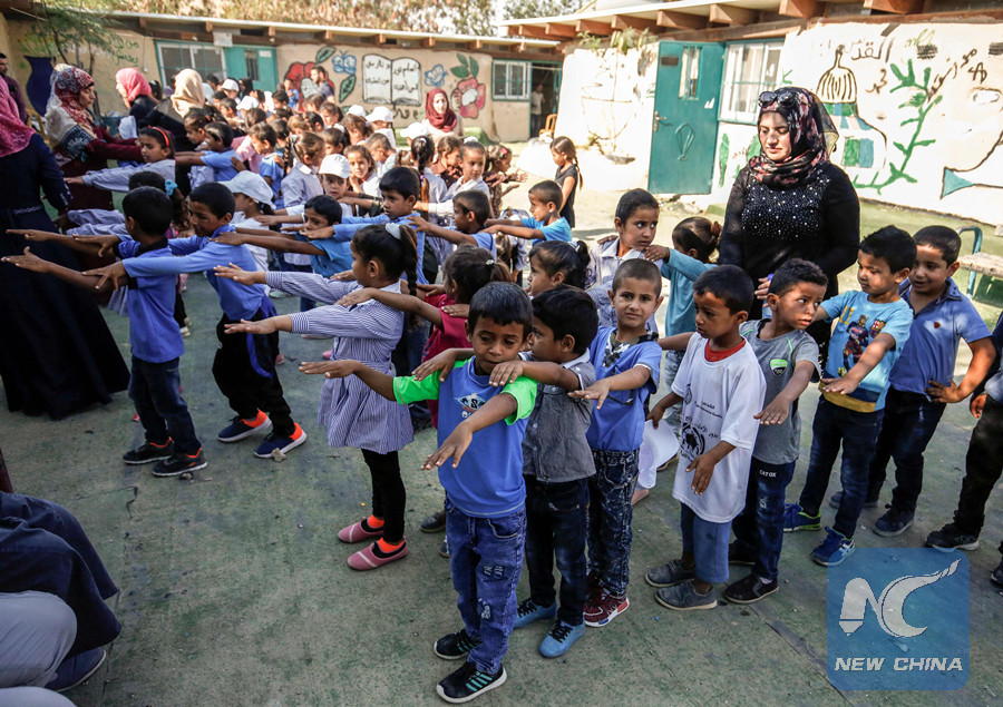 Palestinian children queue up before the early start of classes at a school in the Bedouin village of Khan al-Ahmar in the occupied West Bank on July 16, 2018. (AFP photo)