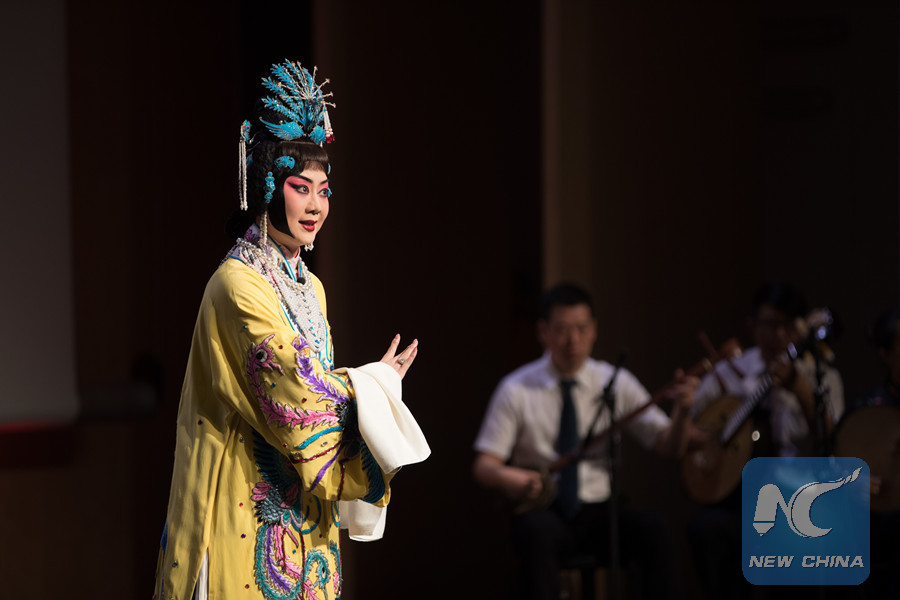 A Chinese artist performs a Chinese traditional Peking opera show at the reception hosted by the Chinese Embassy in Israel in Tel Aviv, on Sept. 16, 2018. (Xinhua/Guo Yu)