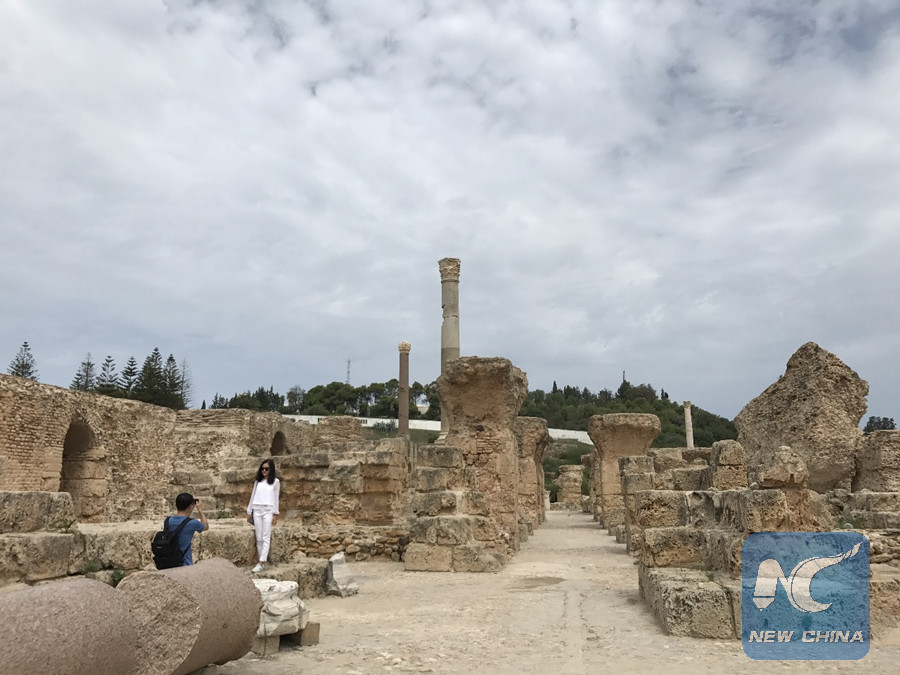 Two Chinese tourists take photos at the Carthage archeological site in northern Tunisia on Sept. 10, 2018. (Xinhua photo)