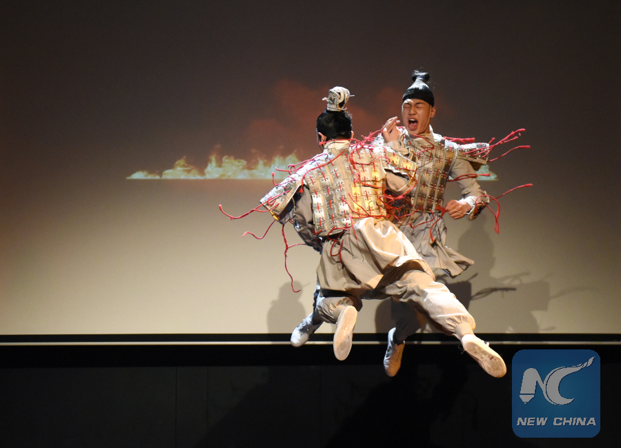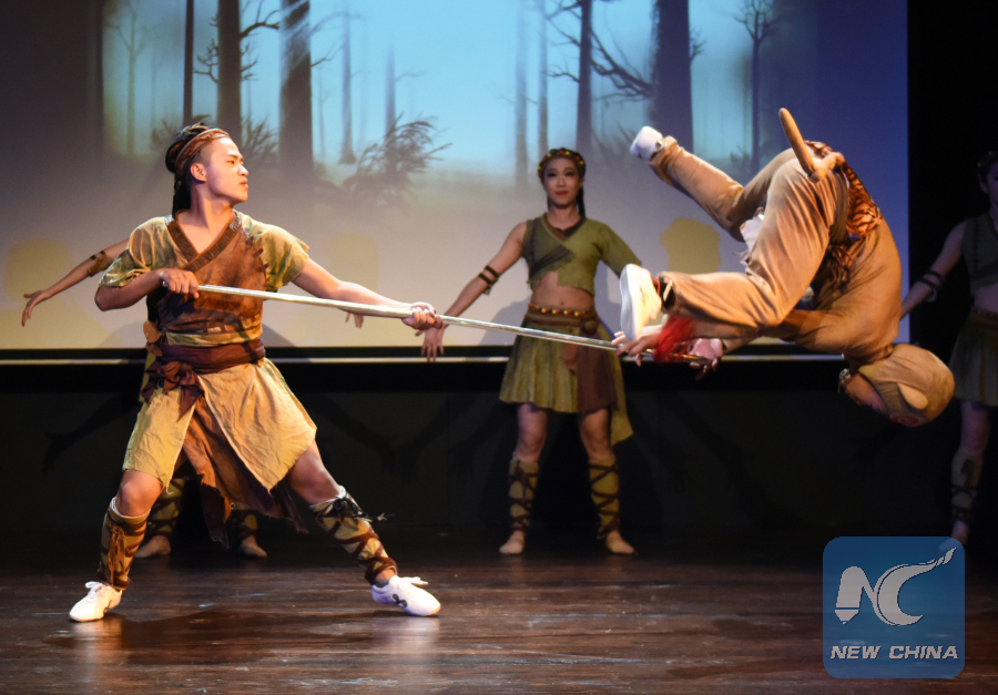 The performers from the art troupe of the Beijing-based Capital University of Physical Education and Sports displayed the origin of Wushu by practising fights between hunters and animals in ancient times.