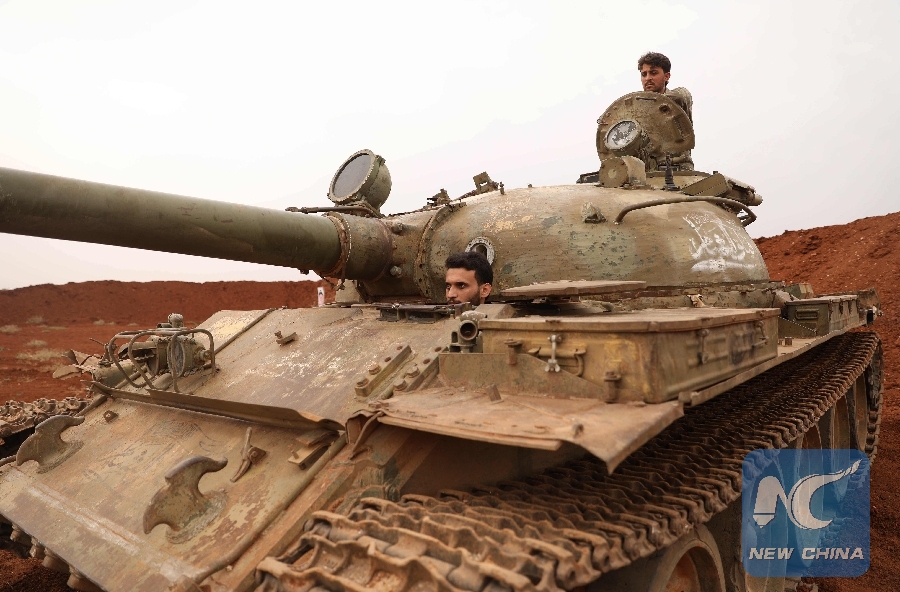 Syrian rebel-fighters from the National Liberation Front (NLF) secure a tank, part of heavy weapons and equipment withdrawn yesterday from a planned buffer zone around Idlib in one of the group's rear positions in a rebel-held area in the southwestern Syrian province on October 9, 2018. (AFP Photo)
