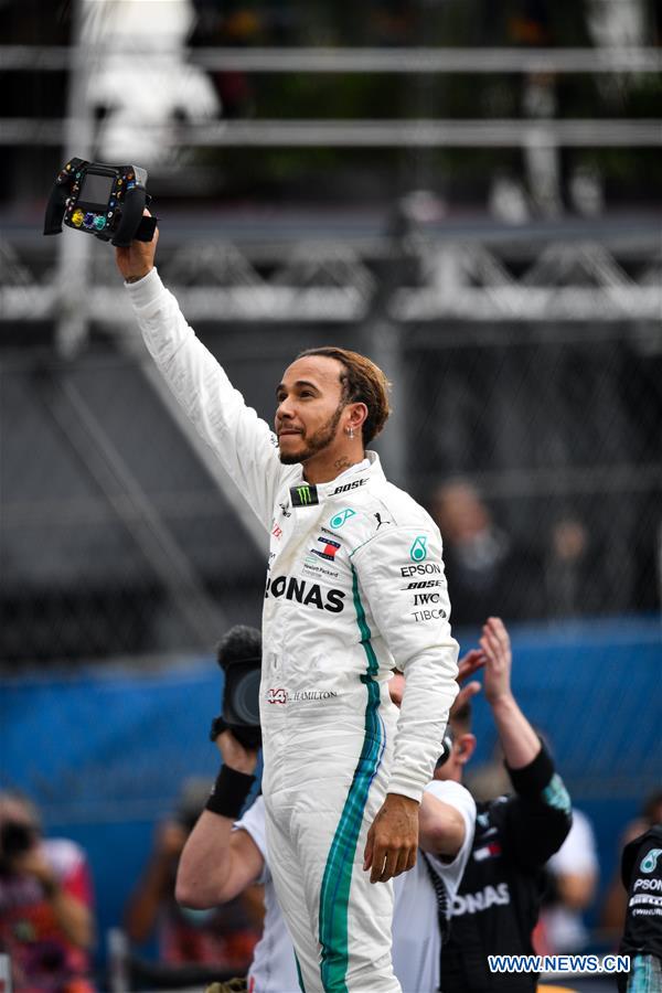 Mercedes' Lewis Hamilton of Britain celebrates after the Mexican Formula One Grand Prix at Hermanos Rodriguez racetrack in Mexico City, Mexico on Oct. 28, 2018. (Xinhua/Xin Yuewei)