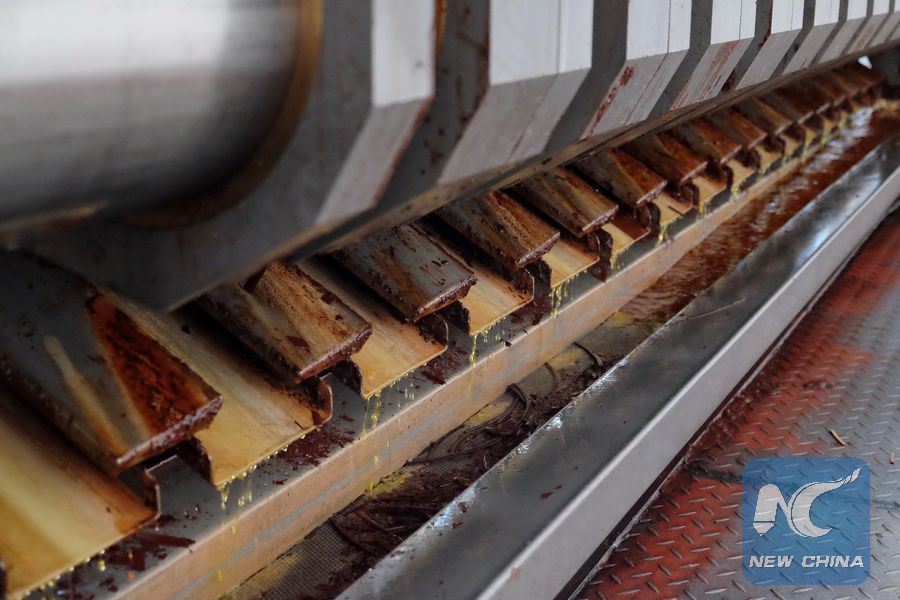 Cocoa butter is being extracted at a factory in Tema, east Ghana, Oct. 25, 2018.(Xinhua/Zhao Shuting)