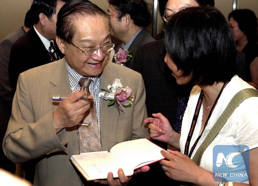 In this file photo, JinYong (L) signs a book for a reader during Hong Kong Book Fair in Hong Kong, south China, on July 22, 2001. (Xinhua/Shen Qiao)