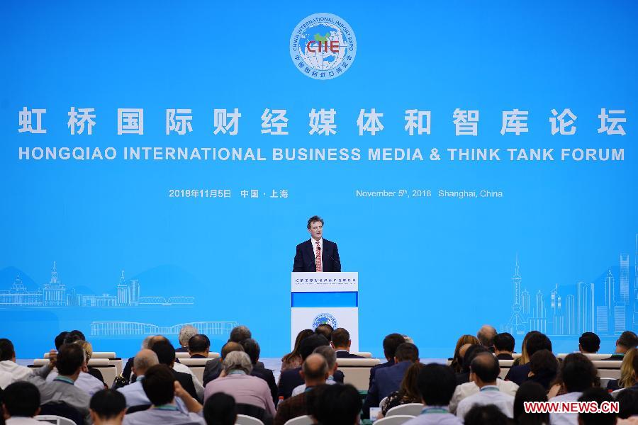 John Micklethwait, Bloomberg's editor-in-chief, speaks at Hongqiao International Business Media & Think Tank Forum in Shanghai, east China, Nov. 5, 2018. (Xinhua/Cai Yang)