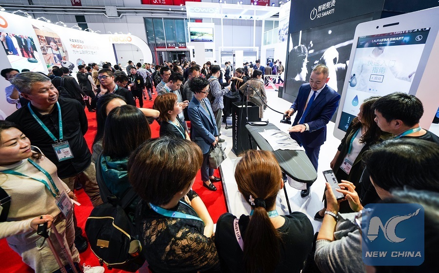 Visitors learn about the scald proofing hot iron at the first China International Import Expo (CIIE) in Shanghai, east China, Nov. 6, 2018. (Xinhua/Wang Jianhua)