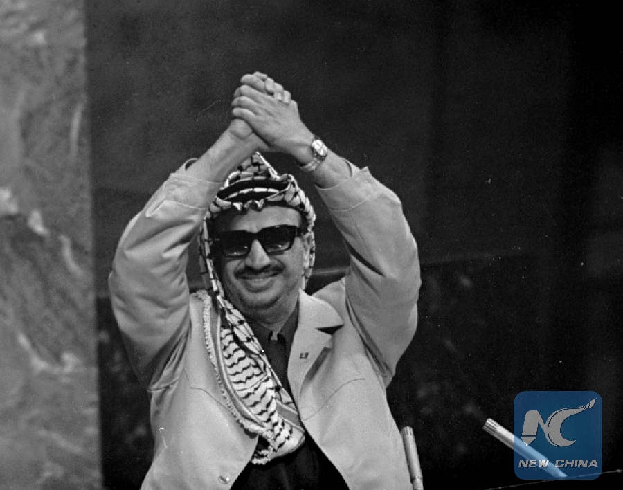 File photo: In this Nov. 13, 1974 file photo, Yasser Arafat clasps his arms over his head as he addresses the United Nations General Assembly, at U.N. headquarters. (AP photo)