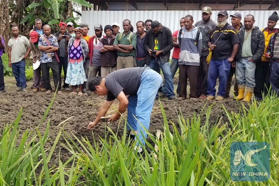 Lin Yingxing, a Chinese expert, demonstrates how to grow dry-land rice at the Goroka Juncao & Dry-land Rice Technology Demonstration Base in Papua New Guinea's Eastern Highlands Province (EHP). (Xinhua/Mo Huaying)